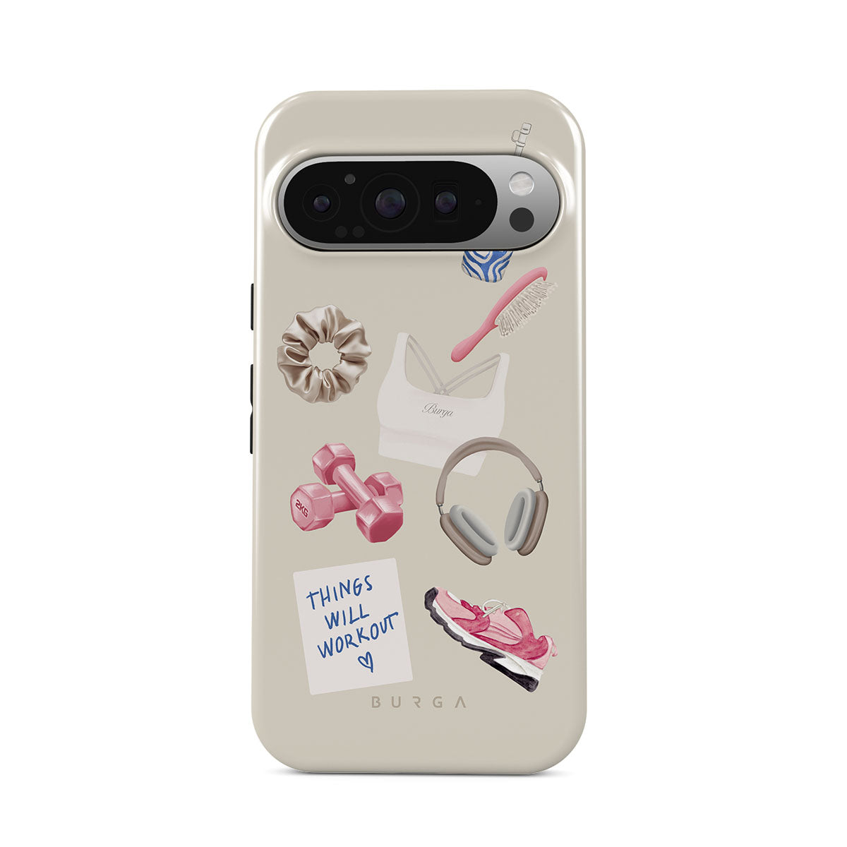 Este design contém: halteres, auscultadores, garrafa térmica, escova de cabelo, ténis rosa, sutiã desportivo, barra Crunchie, nota adesiva "As coisas vão dar certo".