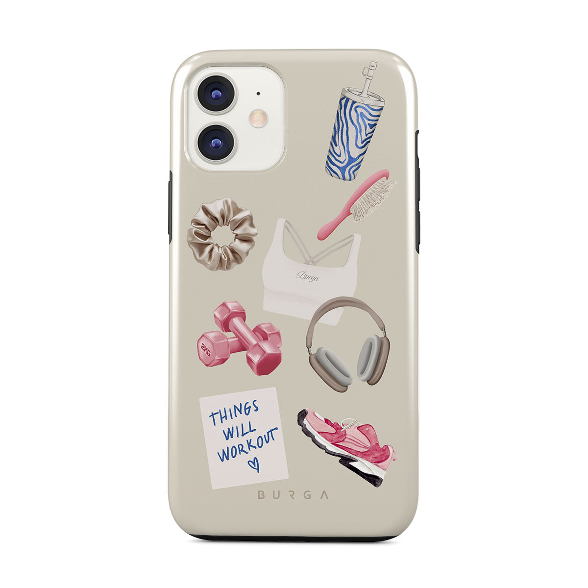 Este design contém: halteres, auscultadores, garrafa térmica, escova de cabelo, ténis rosa, sutiã desportivo, barra Crunchie, nota adesiva "As coisas vão dar certo".