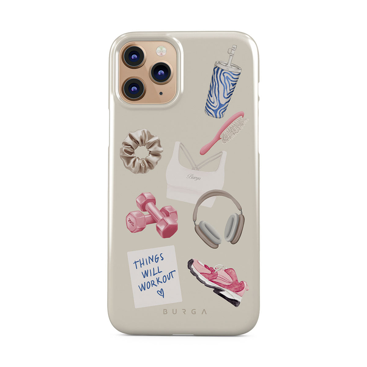 Este design contém: halteres, auscultadores, garrafa térmica, escova de cabelo, ténis rosa, sutiã desportivo, barra Crunchie, nota adesiva "As coisas vão dar certo".