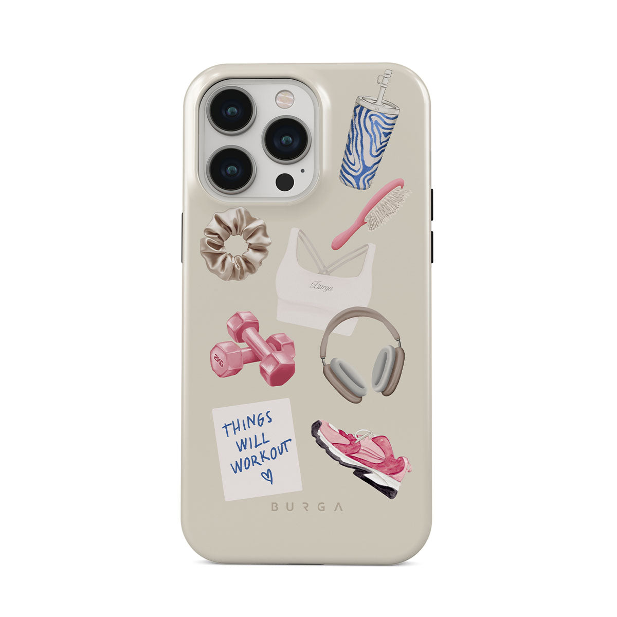 Este design contém: halteres, auscultadores, garrafa térmica, escova de cabelo, ténis rosa, sutiã desportivo, barra Crunchie, nota adesiva "As coisas vão dar certo".