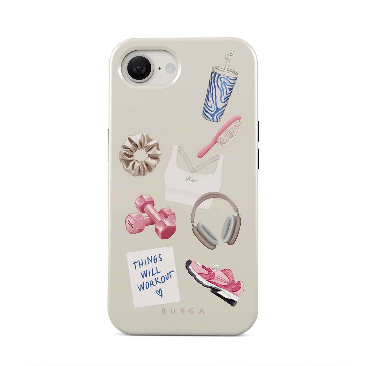 Este design contém: halteres, auscultadores, garrafa térmica, escova de cabelo, ténis rosa, sutiã desportivo, barra Crunchie, nota adesiva "As coisas vão dar certo".