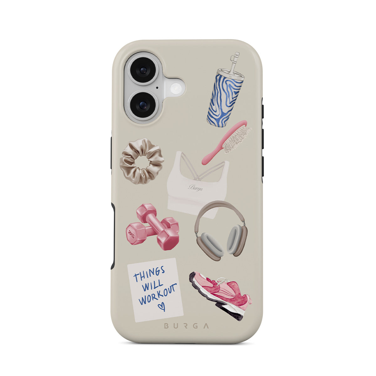 Este design contém: halteres, auscultadores, garrafa térmica, escova de cabelo, ténis rosa, sutiã desportivo, barra Crunchie, nota adesiva "As coisas vão dar certo".