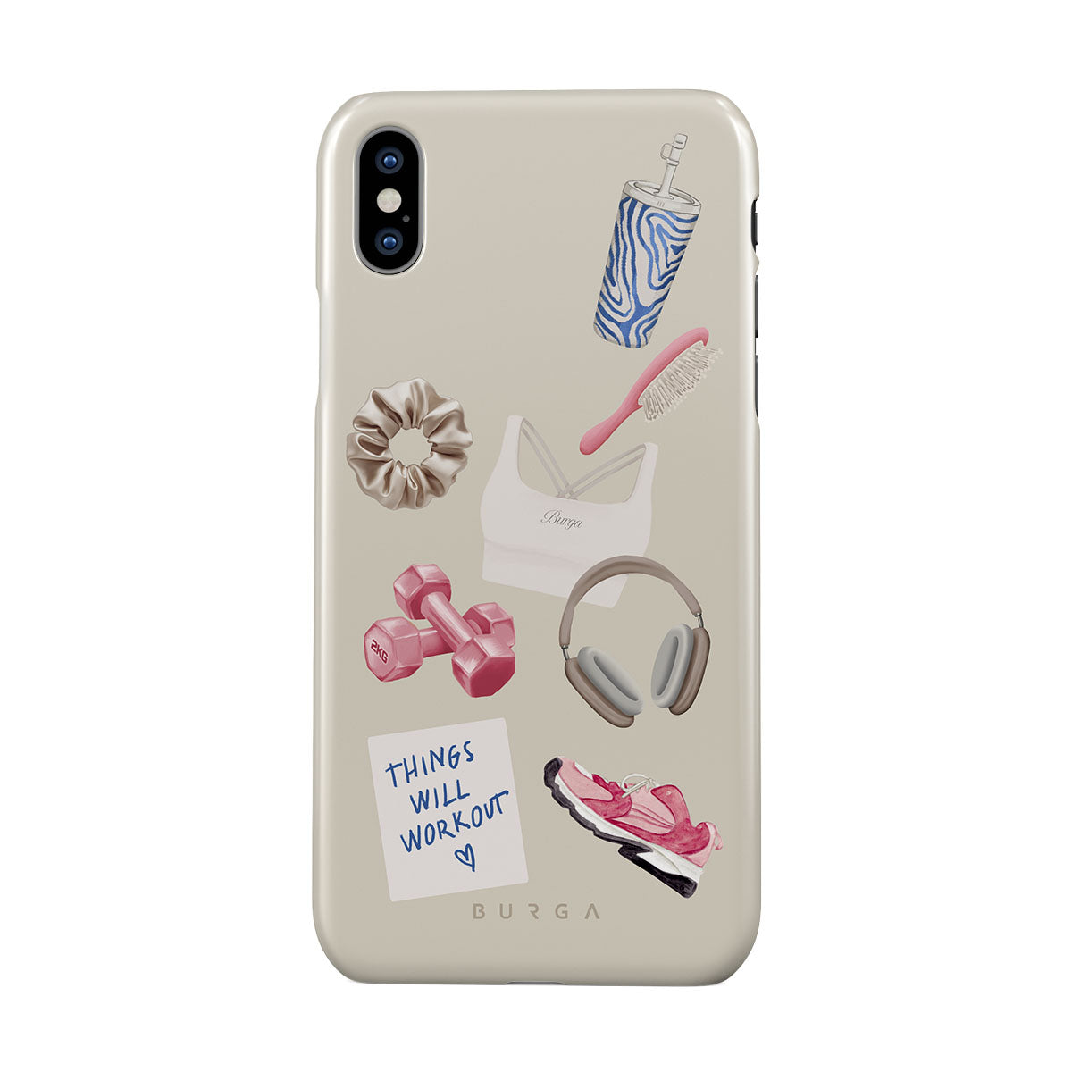 Este design contém: halteres, auscultadores, garrafa térmica, escova de cabelo, ténis rosa, sutiã desportivo, barra Crunchie, nota adesiva "As coisas vão dar certo".