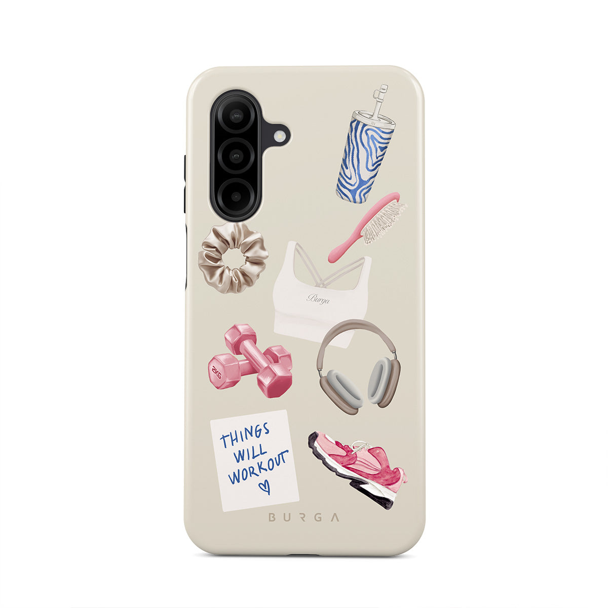 Este design contém: halteres, auscultadores, garrafa térmica, escova de cabelo, ténis rosa, sutiã desportivo, barra Crunchie, nota adesiva "As coisas vão dar certo".