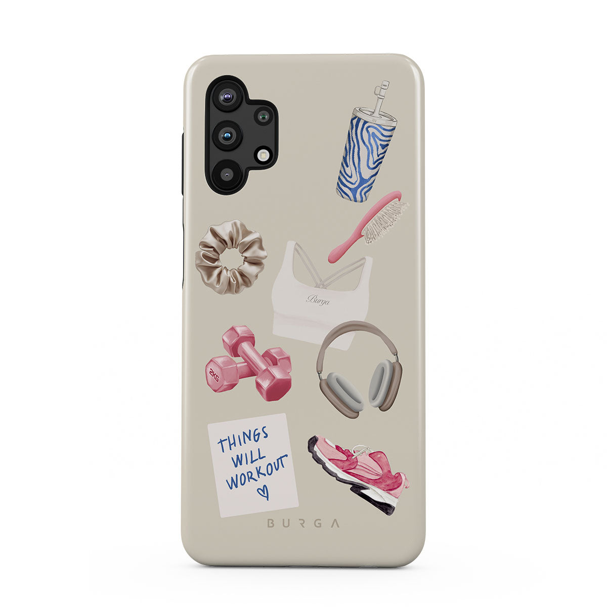 Este design contém: halteres, auscultadores, garrafa térmica, escova de cabelo, ténis rosa, sutiã desportivo, barra Crunchie, nota adesiva "As coisas vão dar certo".