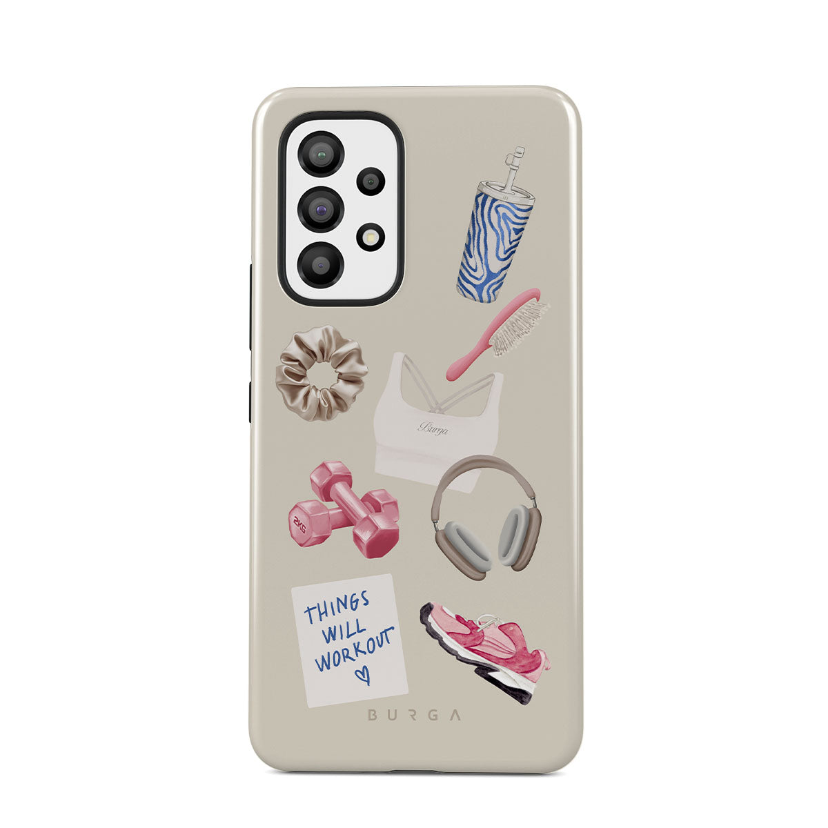 Este design contém: halteres, auscultadores, garrafa térmica, escova de cabelo, ténis rosa, sutiã desportivo, barra Crunchie, nota adesiva "As coisas vão dar certo".