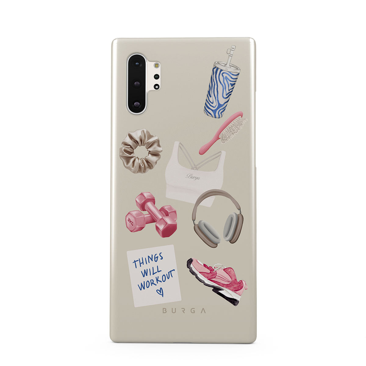 Este design contém: halteres, auscultadores, garrafa térmica, escova de cabelo, ténis rosa, sutiã desportivo, barra Crunchie, nota adesiva "As coisas vão dar certo".