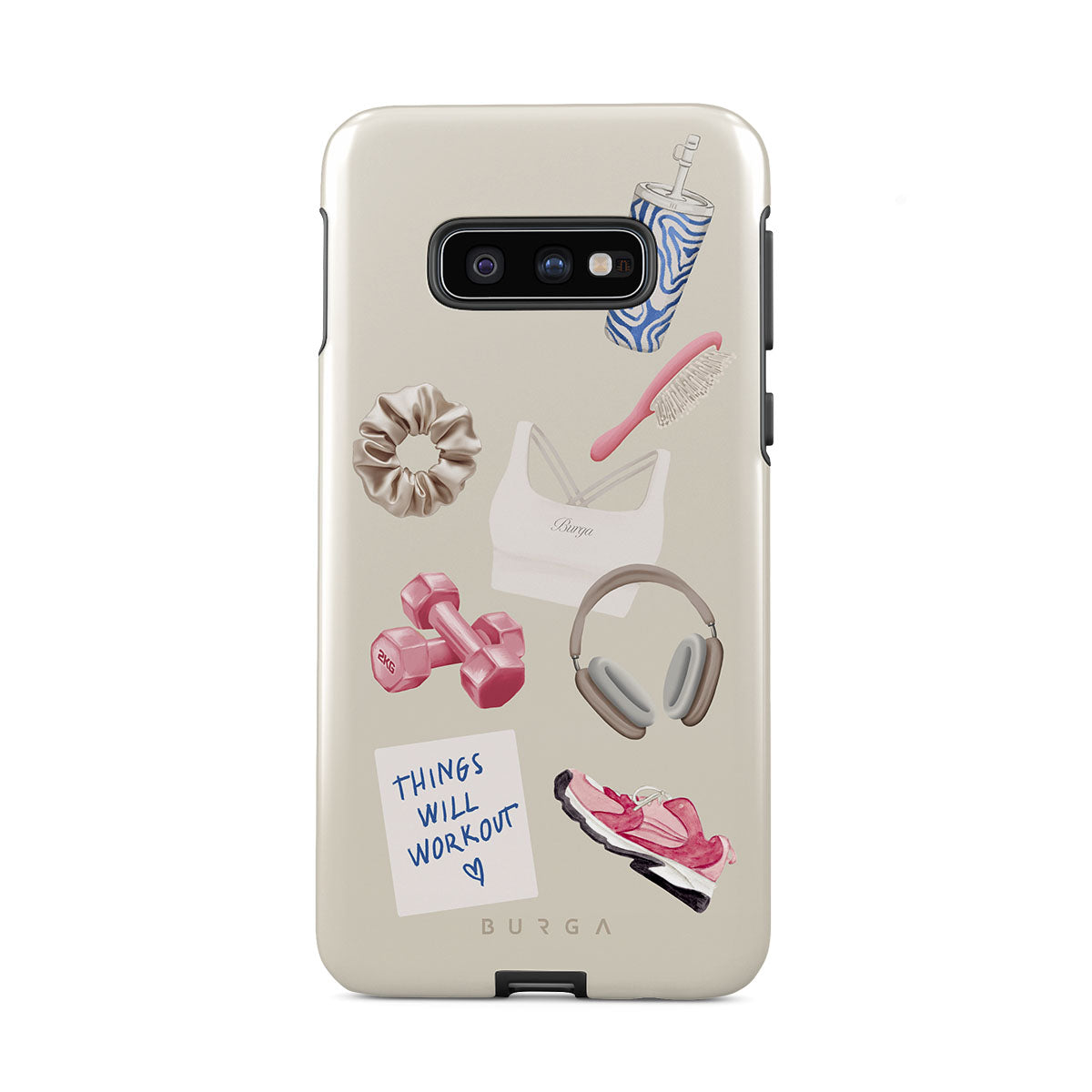 Este design contém: halteres, auscultadores, garrafa térmica, escova de cabelo, ténis rosa, sutiã desportivo, barra Crunchie, nota adesiva "As coisas vão dar certo".