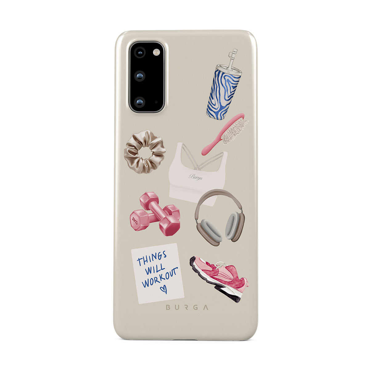 Este design contém: halteres, auscultadores, garrafa térmica, escova de cabelo, ténis rosa, sutiã desportivo, barra Crunchie, nota adesiva "As coisas vão dar certo".