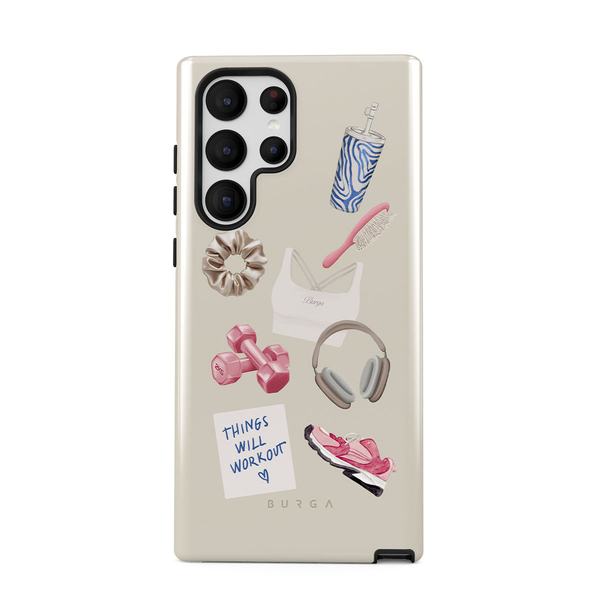 Este design contém: halteres, auscultadores, garrafa térmica, escova de cabelo, ténis rosa, sutiã desportivo, barra Crunchie, nota adesiva "As coisas vão dar certo".