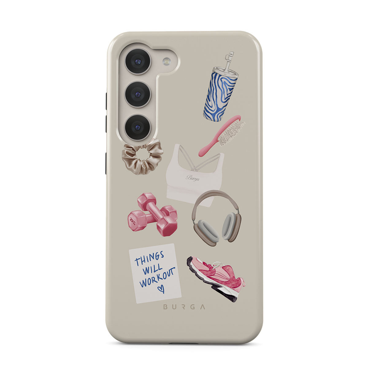 Este design contém: halteres, auscultadores, garrafa térmica, escova de cabelo, ténis rosa, sutiã desportivo, barra Crunchie, nota adesiva "As coisas vão dar certo".