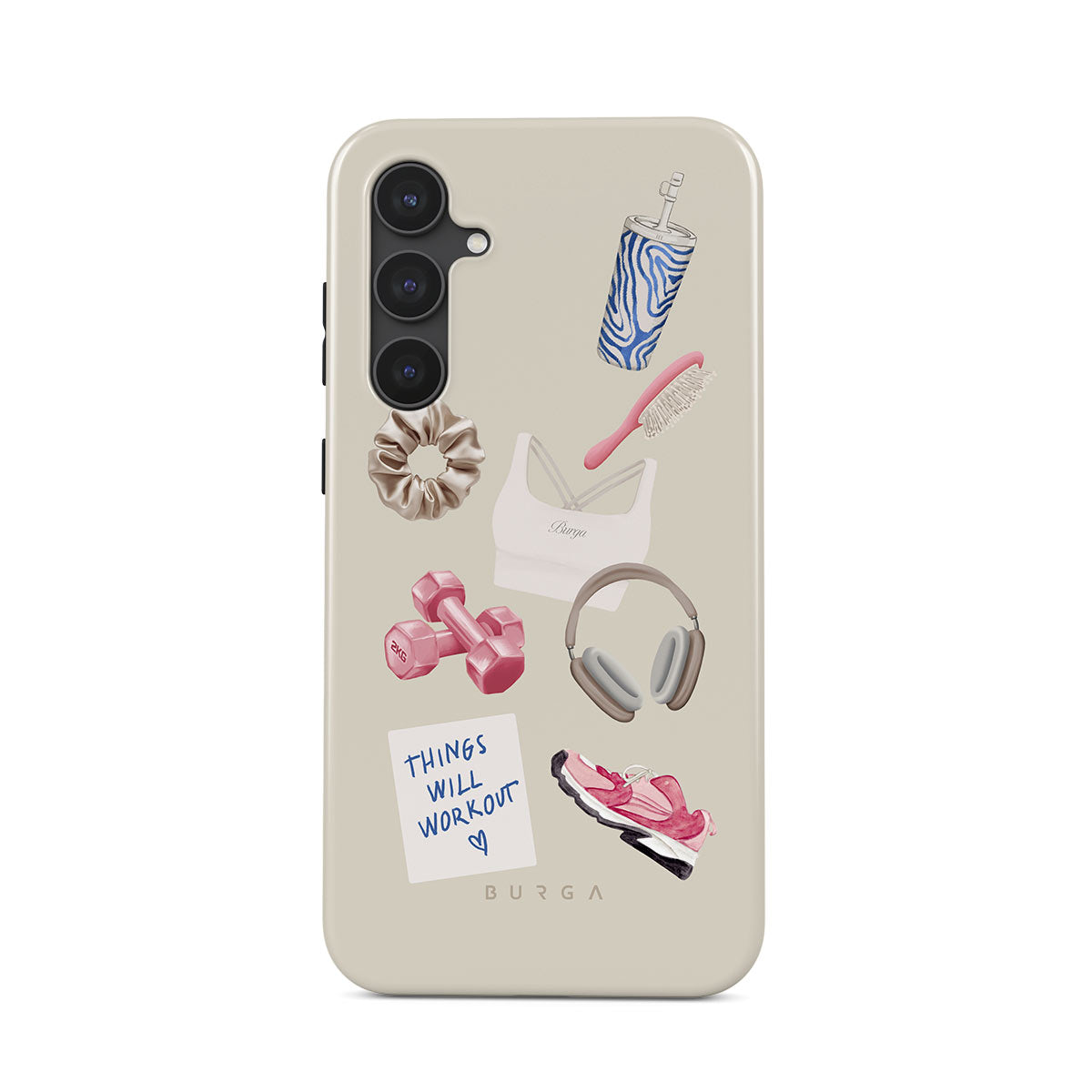 Este design contém: halteres, auscultadores, garrafa térmica, escova de cabelo, ténis rosa, sutiã desportivo, barra Crunchie, nota adesiva "As coisas vão dar certo".