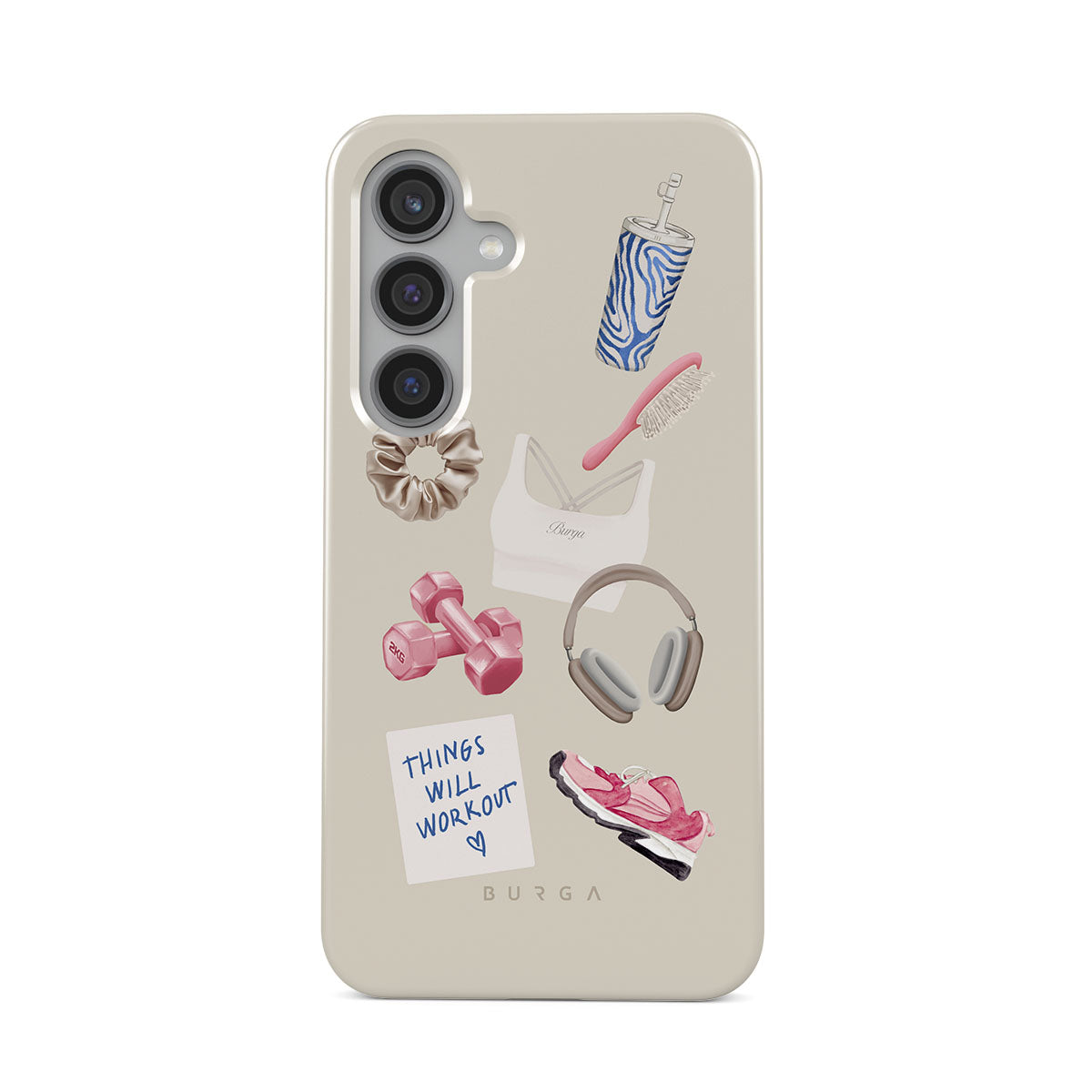 Este design contém: halteres, auscultadores, garrafa térmica, escova de cabelo, ténis rosa, sutiã desportivo, barra Crunchie, nota adesiva "As coisas vão dar certo".