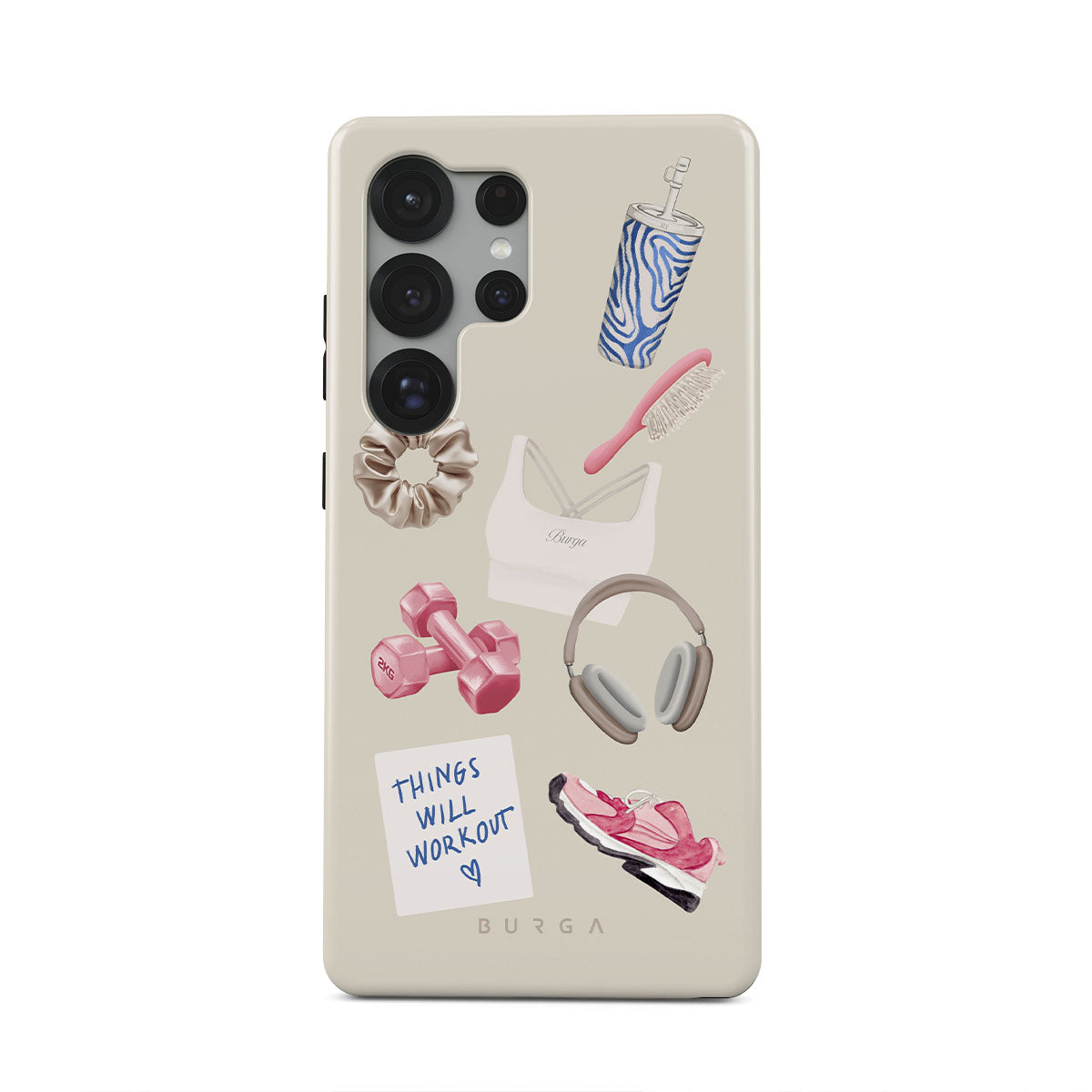 Este design contém: halteres, auscultadores, garrafa térmica, escova de cabelo, ténis rosa, sutiã desportivo, barra Crunchie, nota adesiva "As coisas vão dar certo".