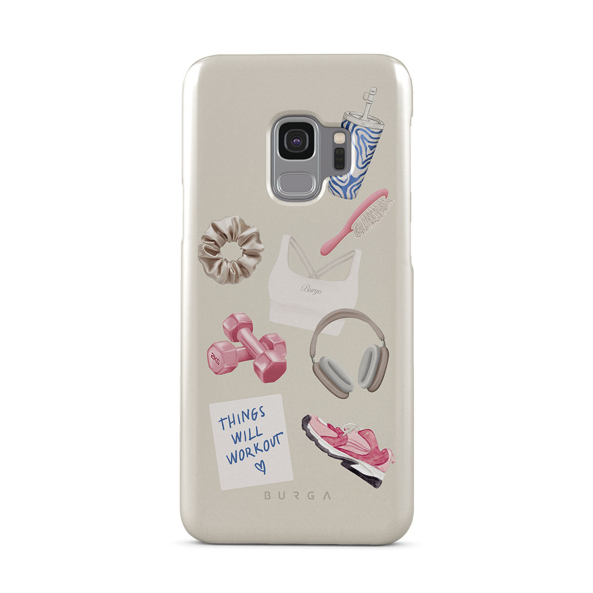 Este design contém: halteres, auscultadores, garrafa térmica, escova de cabelo, ténis rosa, sutiã desportivo, barra Crunchie, nota adesiva "As coisas vão dar certo".