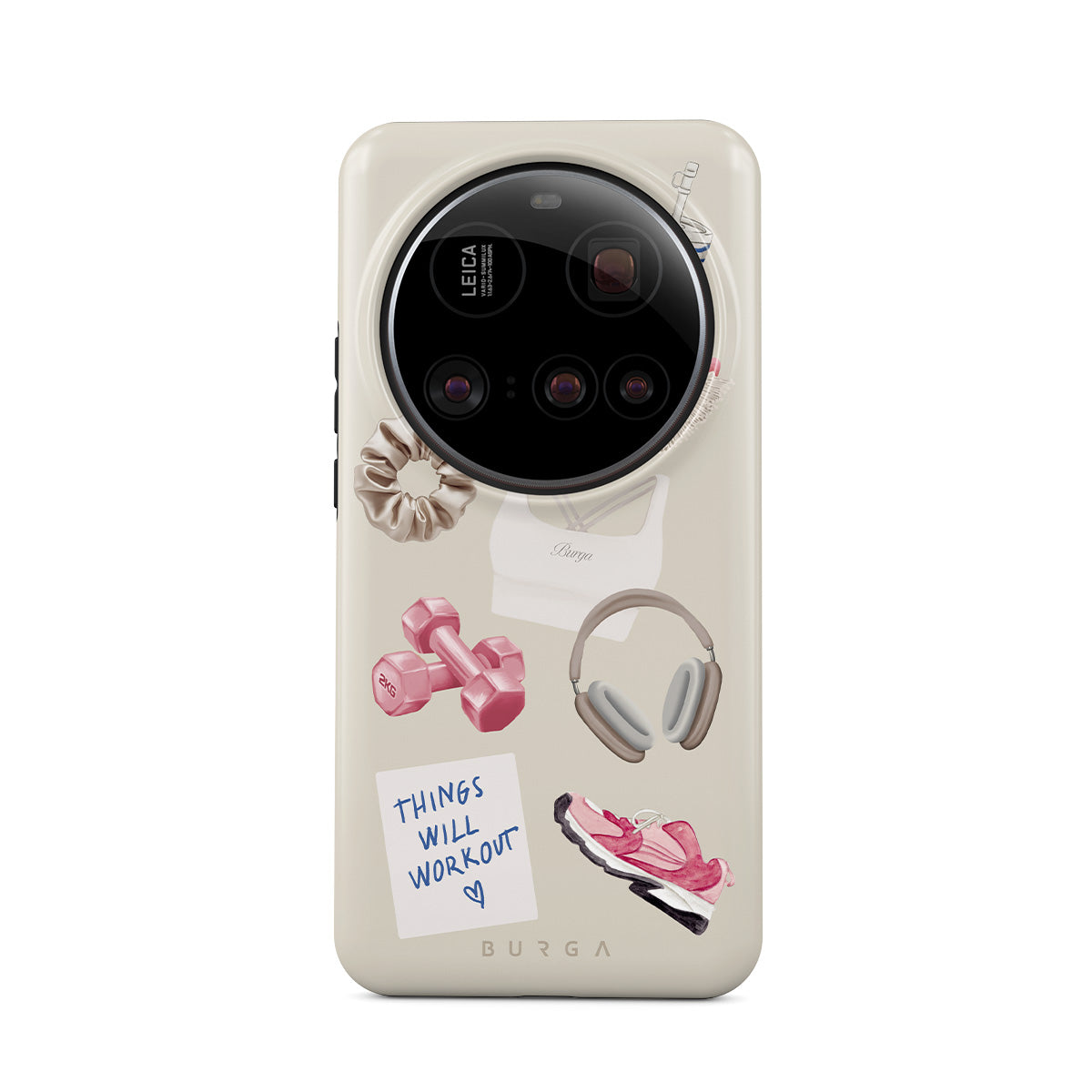 Este design contém: halteres, auscultadores, garrafa térmica, escova de cabelo, ténis rosa, sutiã desportivo, barra Crunchie, nota adesiva "As coisas vão dar certo".