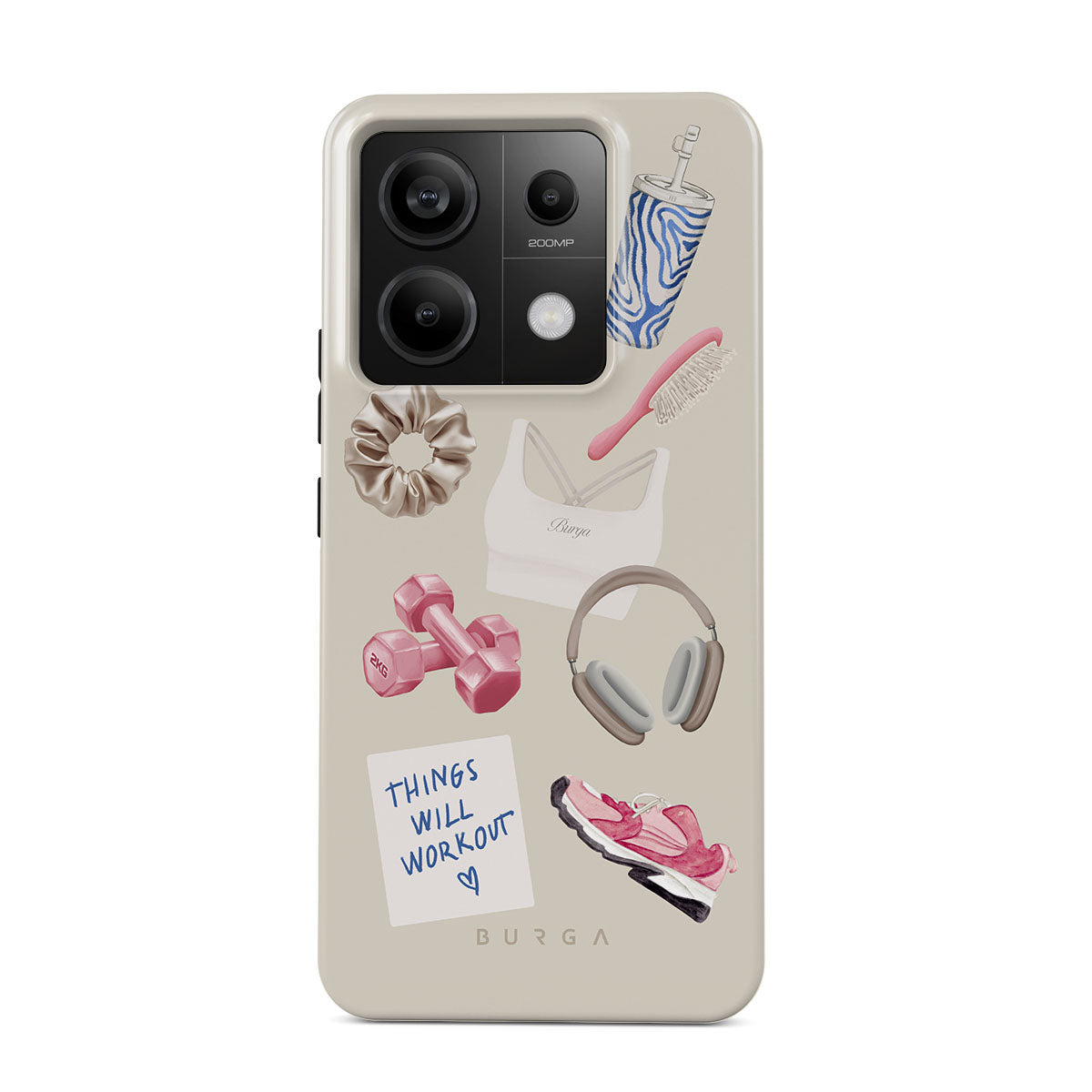 Este design contém: halteres, auscultadores, garrafa térmica, escova de cabelo, ténis rosa, sutiã desportivo, barra Crunchie, nota adesiva "As coisas vão dar certo".