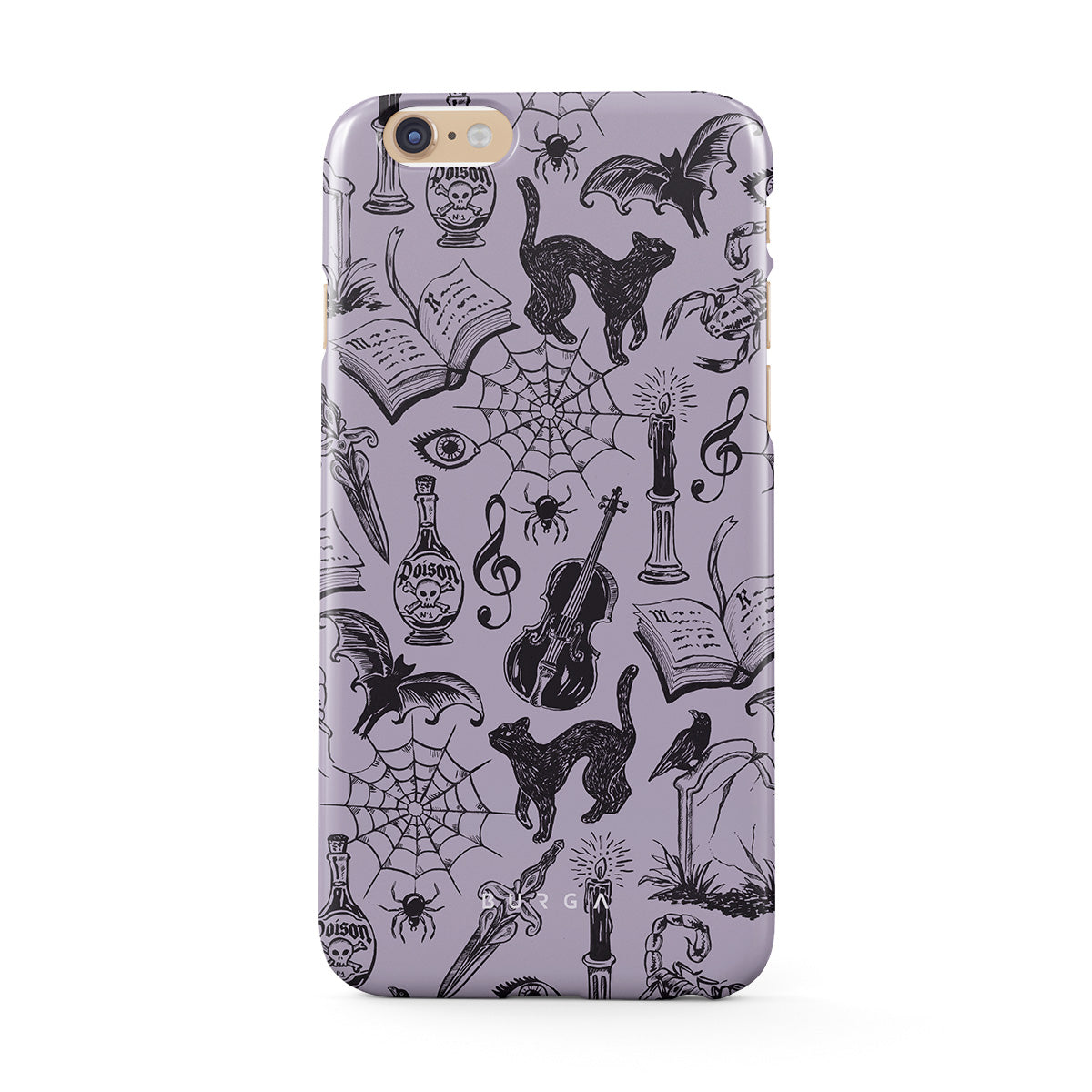Este design contém: rabiscos góticos, elementos místicos, aranhas, teia de aranha, gato, violino, olho, vela, adaga, livro, morcego, corvo, escorpião