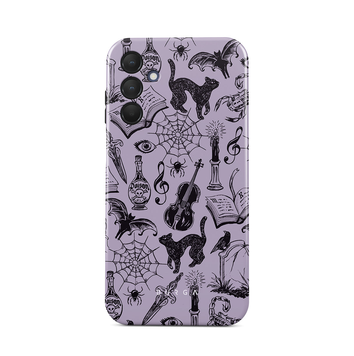 Este design contém: rabiscos góticos, elementos místicos, aranhas, teia de aranha, gato, violino, olho, vela, adaga, livro, morcego, corvo, escorpião