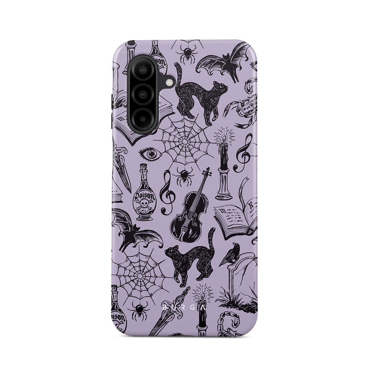 Este design contém: rabiscos góticos, elementos místicos, aranhas, teia de aranha, gato, violino, olho, vela, adaga, livro, morcego, corvo, escorpião