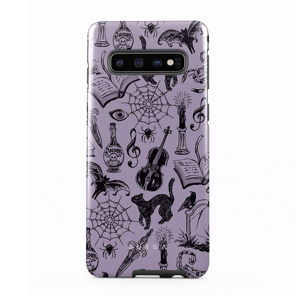 Este design contém: rabiscos góticos, elementos místicos, aranhas, teia de aranha, gato, violino, olho, vela, adaga, livro, morcego, corvo, escorpião