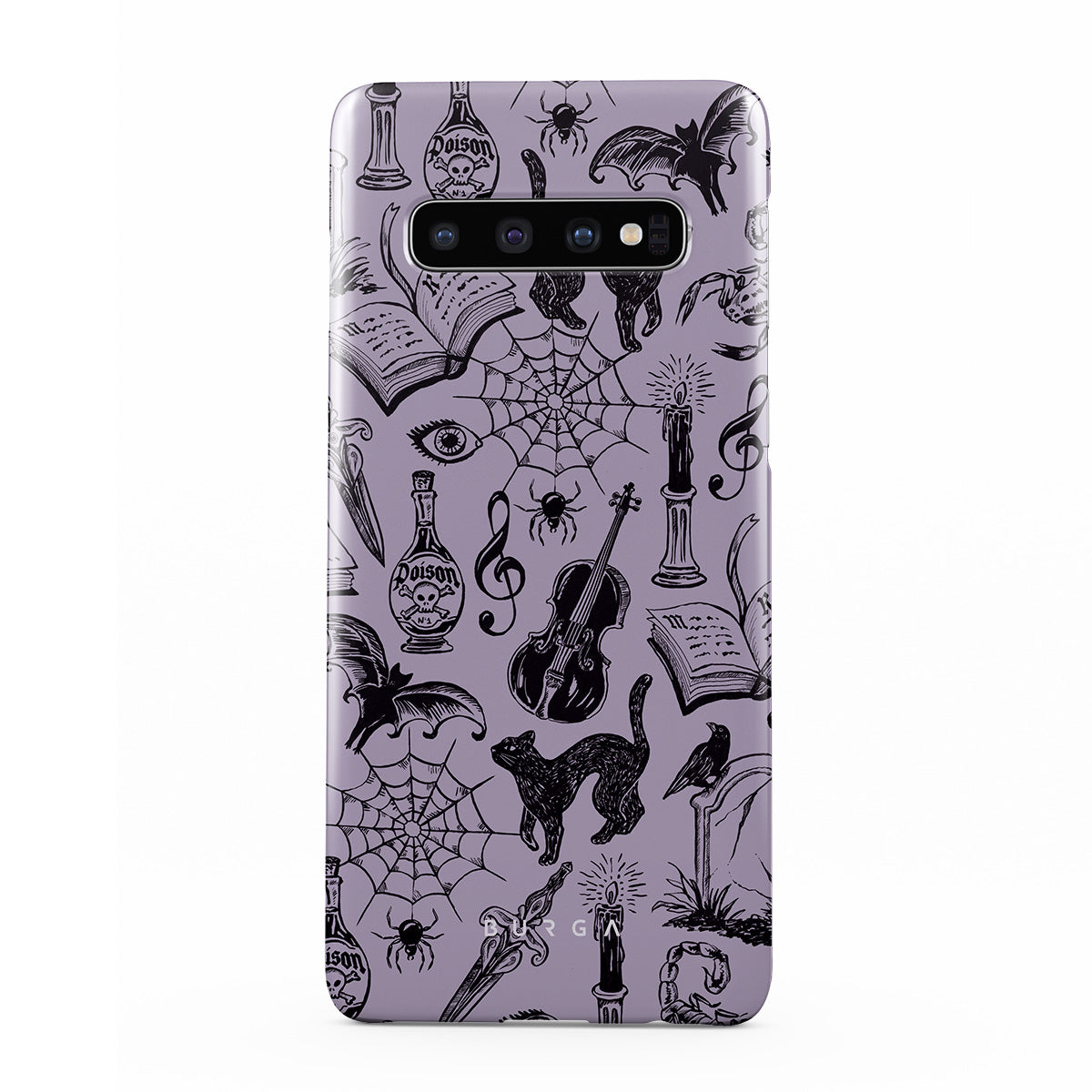 Este design contém: rabiscos góticos, elementos místicos, aranhas, teia de aranha, gato, violino, olho, vela, adaga, livro, morcego, corvo, escorpião