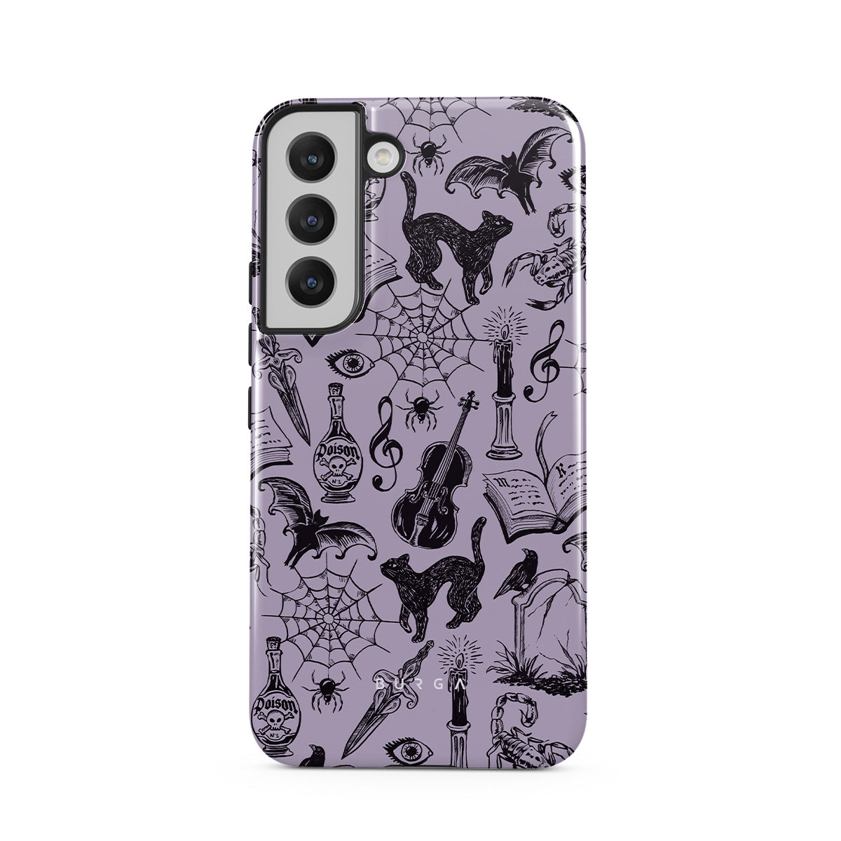 Este design contém: rabiscos góticos, elementos místicos, aranhas, teia de aranha, gato, violino, olho, vela, adaga, livro, morcego, corvo, escorpião