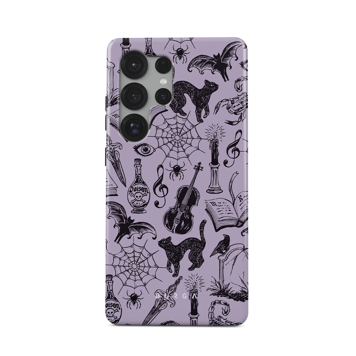 Este design contém: rabiscos góticos, elementos místicos, aranhas, teia de aranha, gato, violino, olho, vela, adaga, livro, morcego, corvo, escorpião