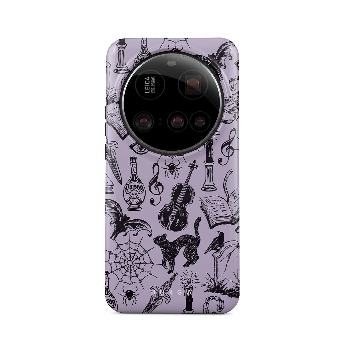 Este design contém: rabiscos góticos, elementos místicos, aranhas, teia de aranha, gato, violino, olho, vela, adaga, livro, morcego, corvo, escorpião