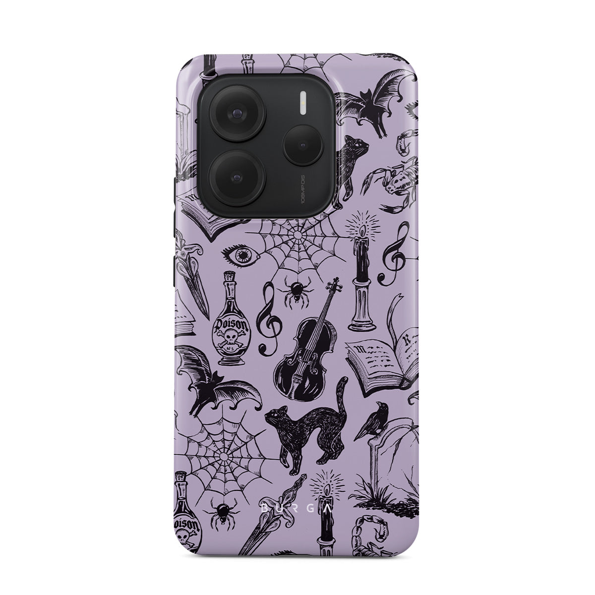 Este design contém: rabiscos góticos, elementos místicos, aranhas, teia de aranha, gato, violino, olho, vela, adaga, livro, morcego, corvo, escorpião