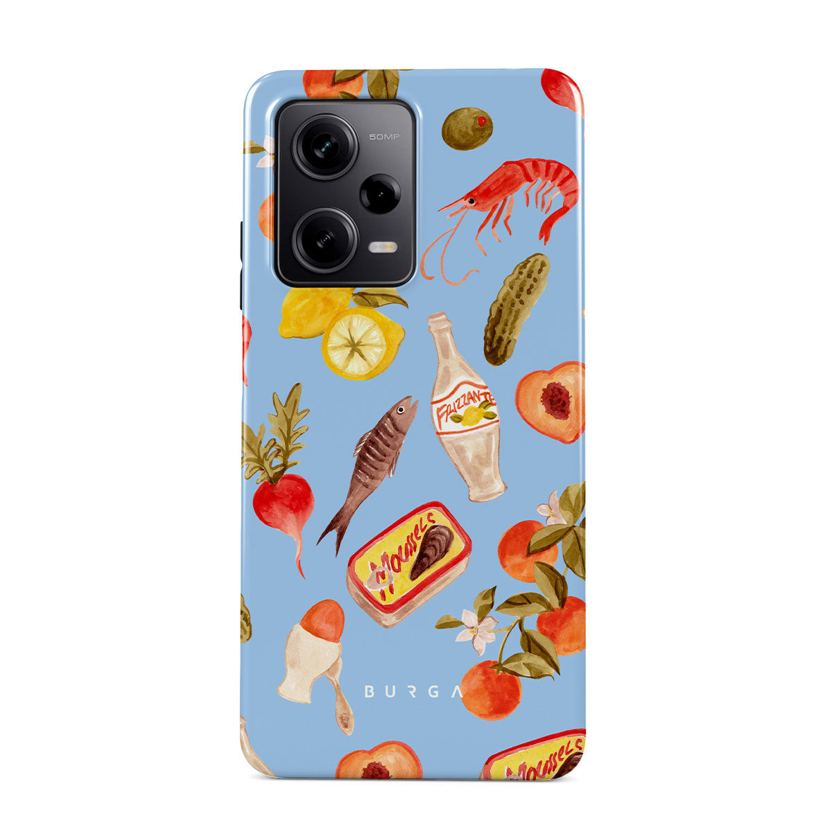 Este design contém:Camarões de rio, citrinos, piquenique, limão, ovo, pickles, vegetação fresca, elementos de praia, pêssego, flor, azeitona.