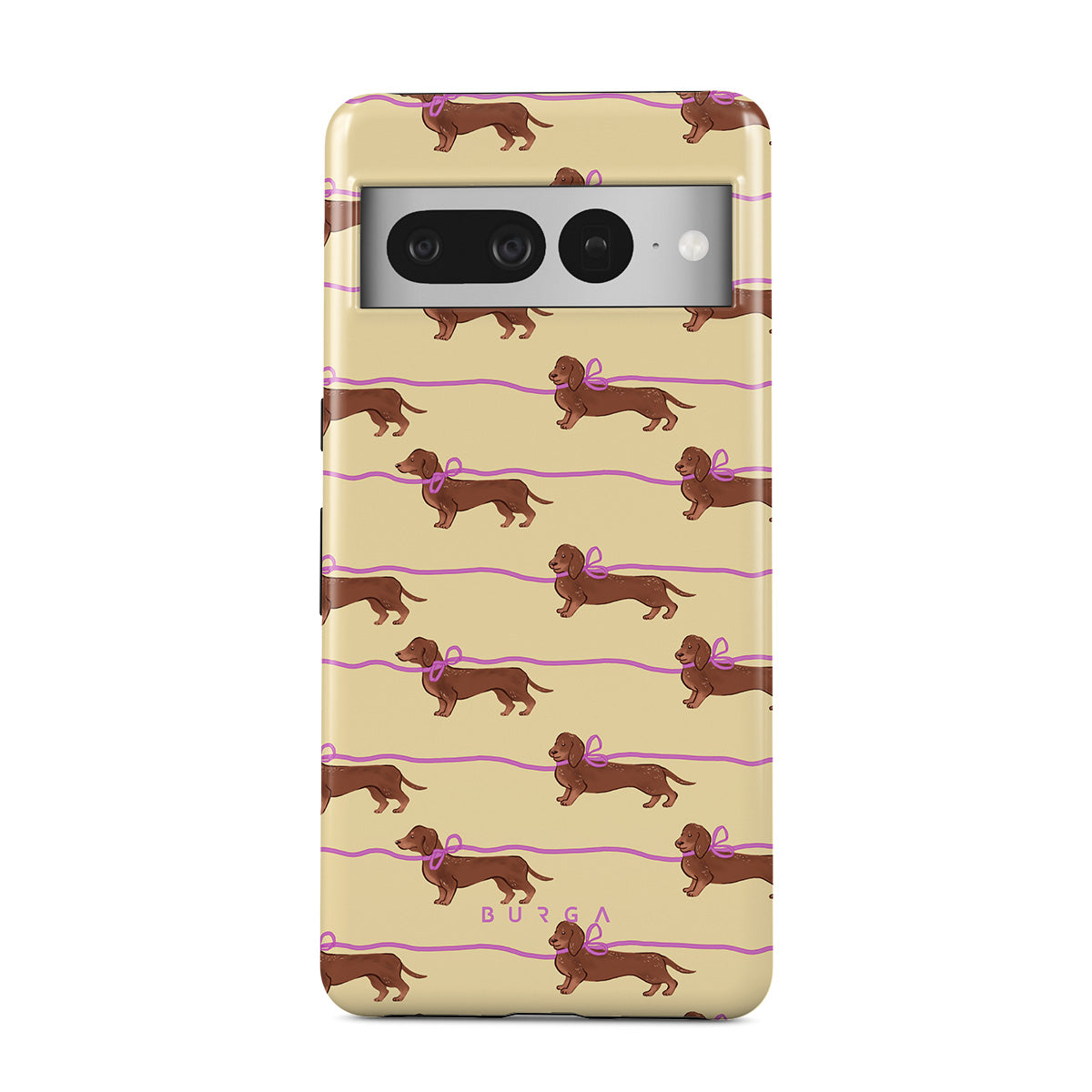 Este design contém: dachshunds com laços rosa, cães fofos.