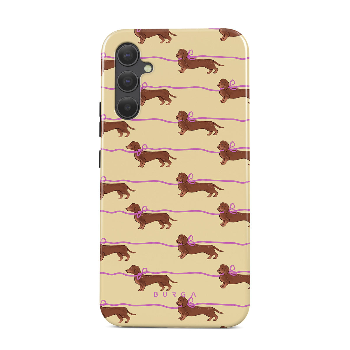 Este design contém: dachshunds com laços rosa, cães fofos.