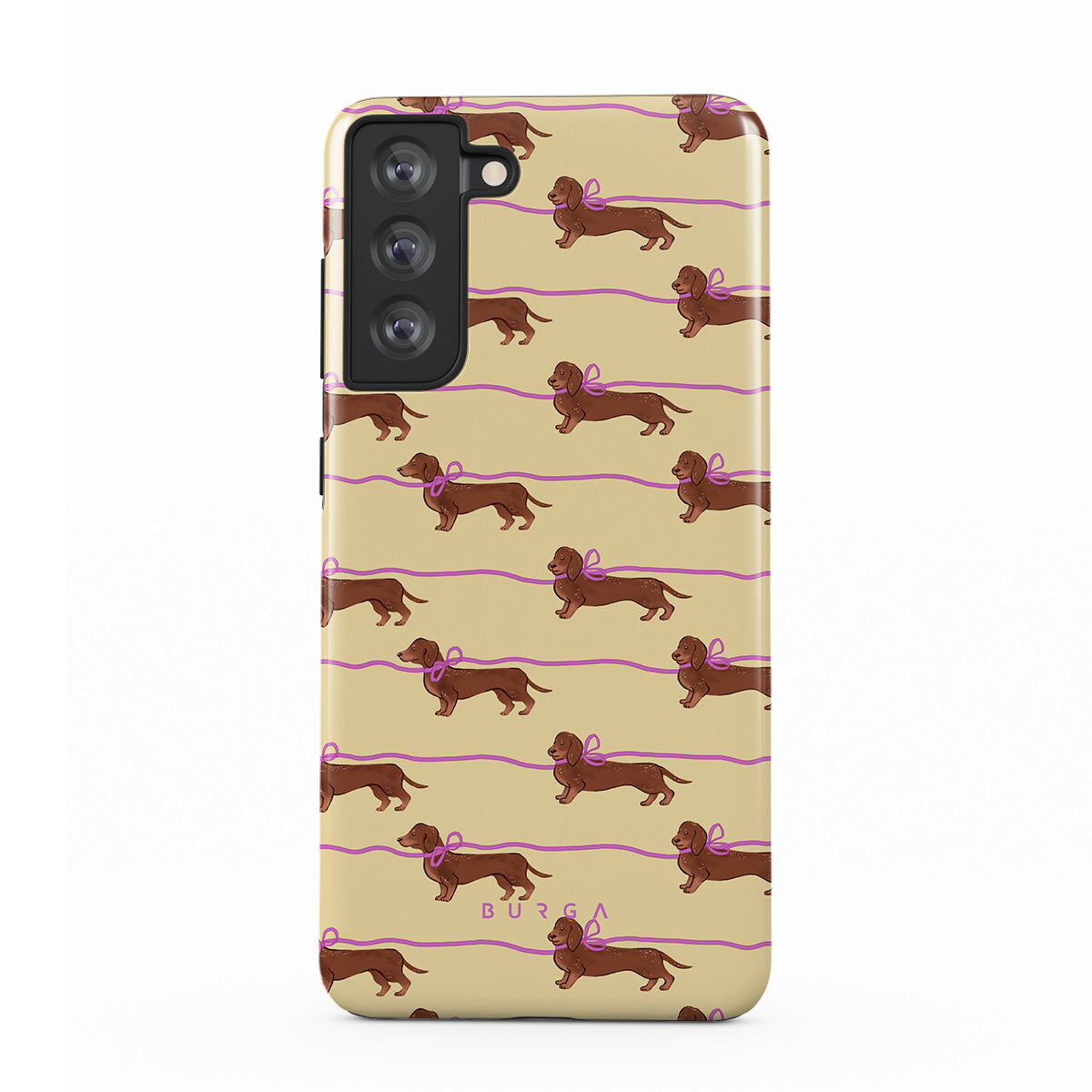 Este design contém: dachshunds com laços rosa, cães fofos.