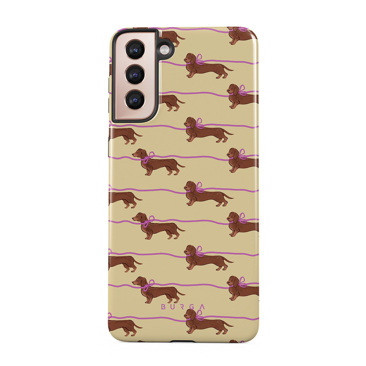 Este design contém: dachshunds com laços rosa, cães fofos.