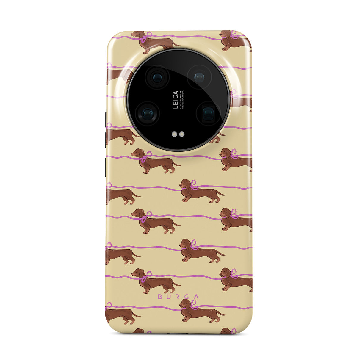 Este design contém: dachshunds com laços rosa, cães fofos.
