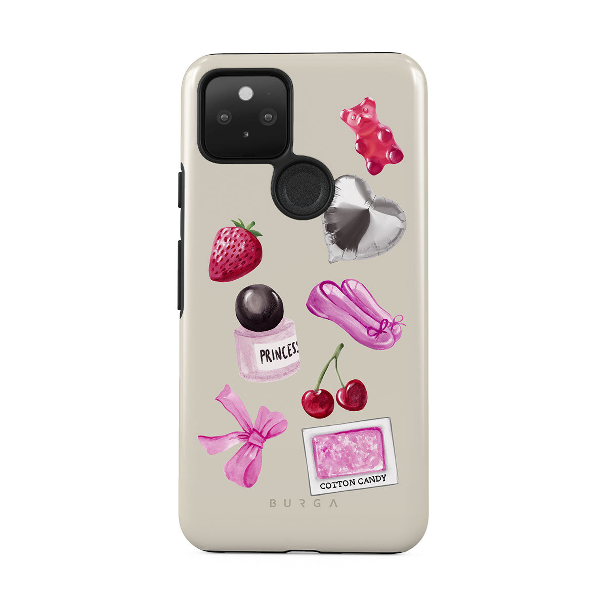 Este design contém: laço rosa, balão prateado em forma de coração, frasco de perfume, morango, cerejas, sapatilhas de ballet rosa, adesivo de algodão doce, ursinho de goma rosa.