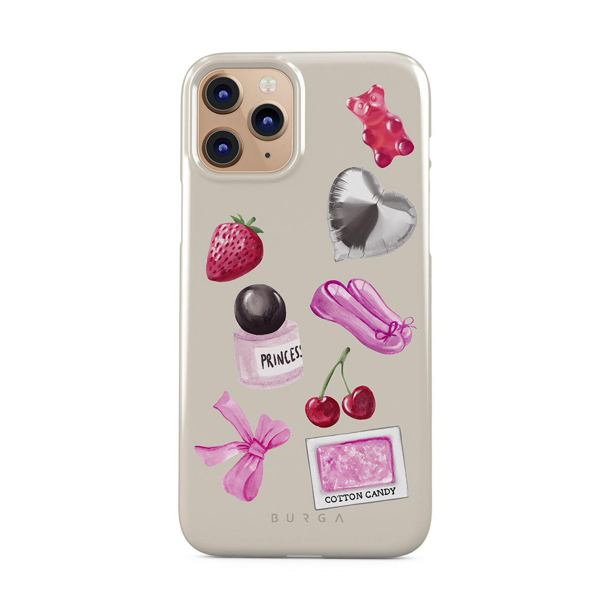 Este design contém: laço rosa, balão prateado em forma de coração, frasco de perfume, morango, cerejas, sapatilhas de ballet rosa, adesivo de algodão doce, ursinho de goma rosa.