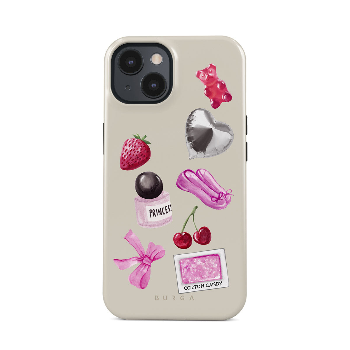 Este design contém: laço rosa, balão prateado em forma de coração, frasco de perfume, morango, cerejas, sapatilhas de ballet rosa, adesivo de algodão doce, ursinho de goma rosa.