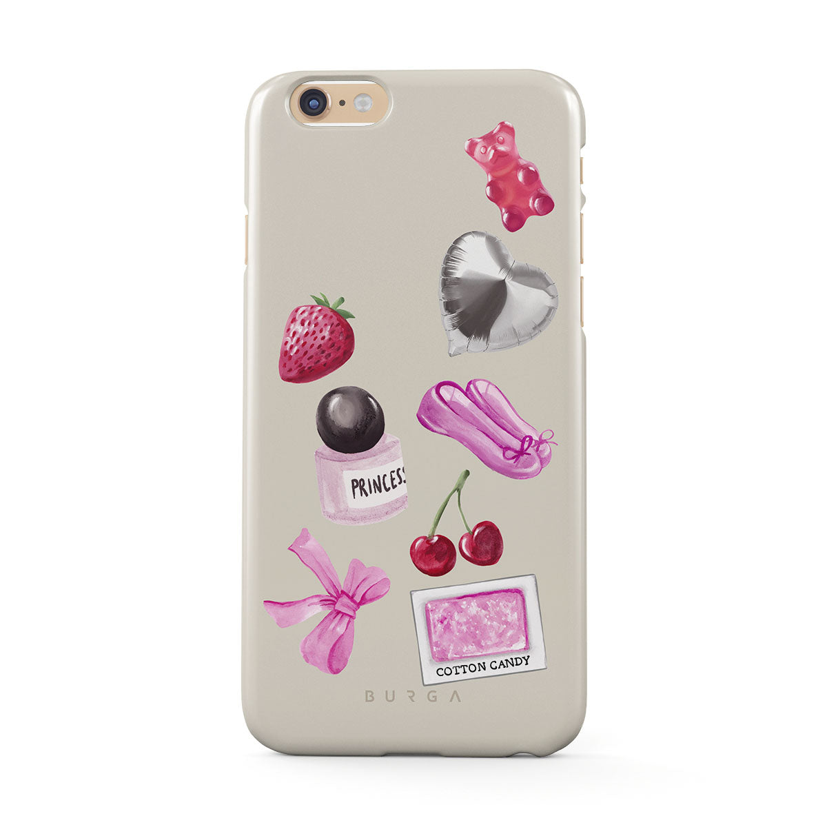 Este design contém: laço rosa, balão prateado em forma de coração, frasco de perfume, morango, cerejas, sapatilhas de ballet rosa, adesivo de algodão doce, ursinho de goma rosa.