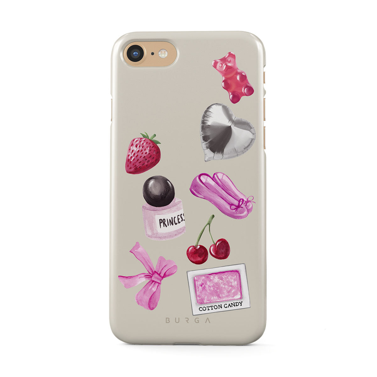 Este design contém: laço rosa, balão prateado em forma de coração, frasco de perfume, morango, cerejas, sapatilhas de ballet rosa, adesivo de algodão doce, ursinho de goma rosa.