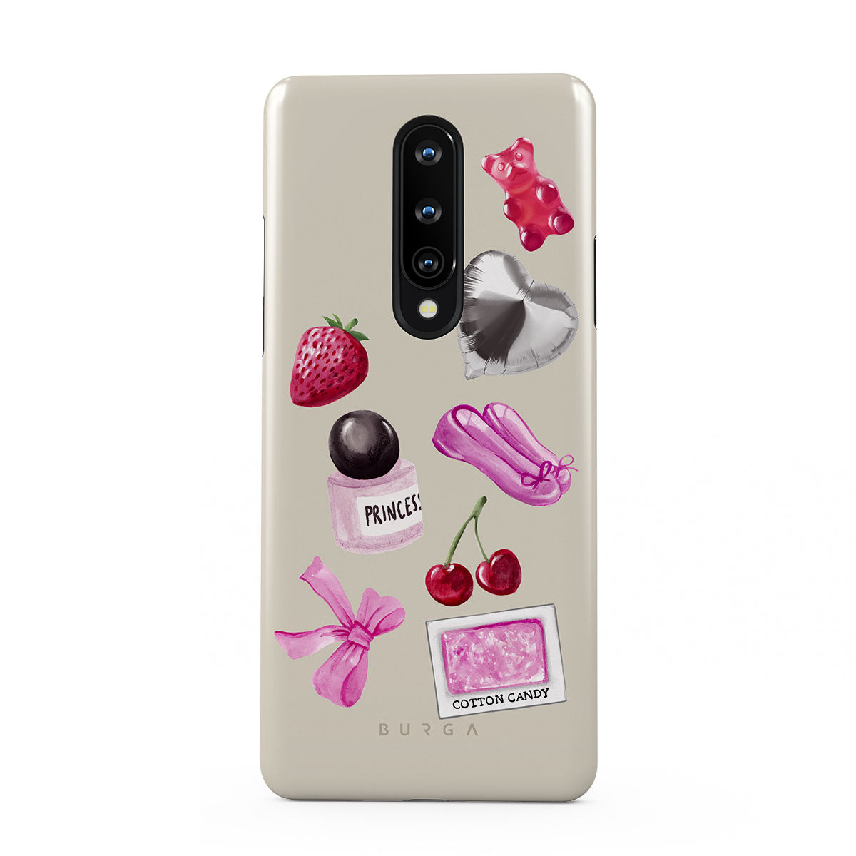 Este design contém: laço rosa, balão prateado em forma de coração, frasco de perfume, morango, cerejas, sapatilhas de ballet rosa, adesivo de algodão doce, ursinho de goma rosa.
