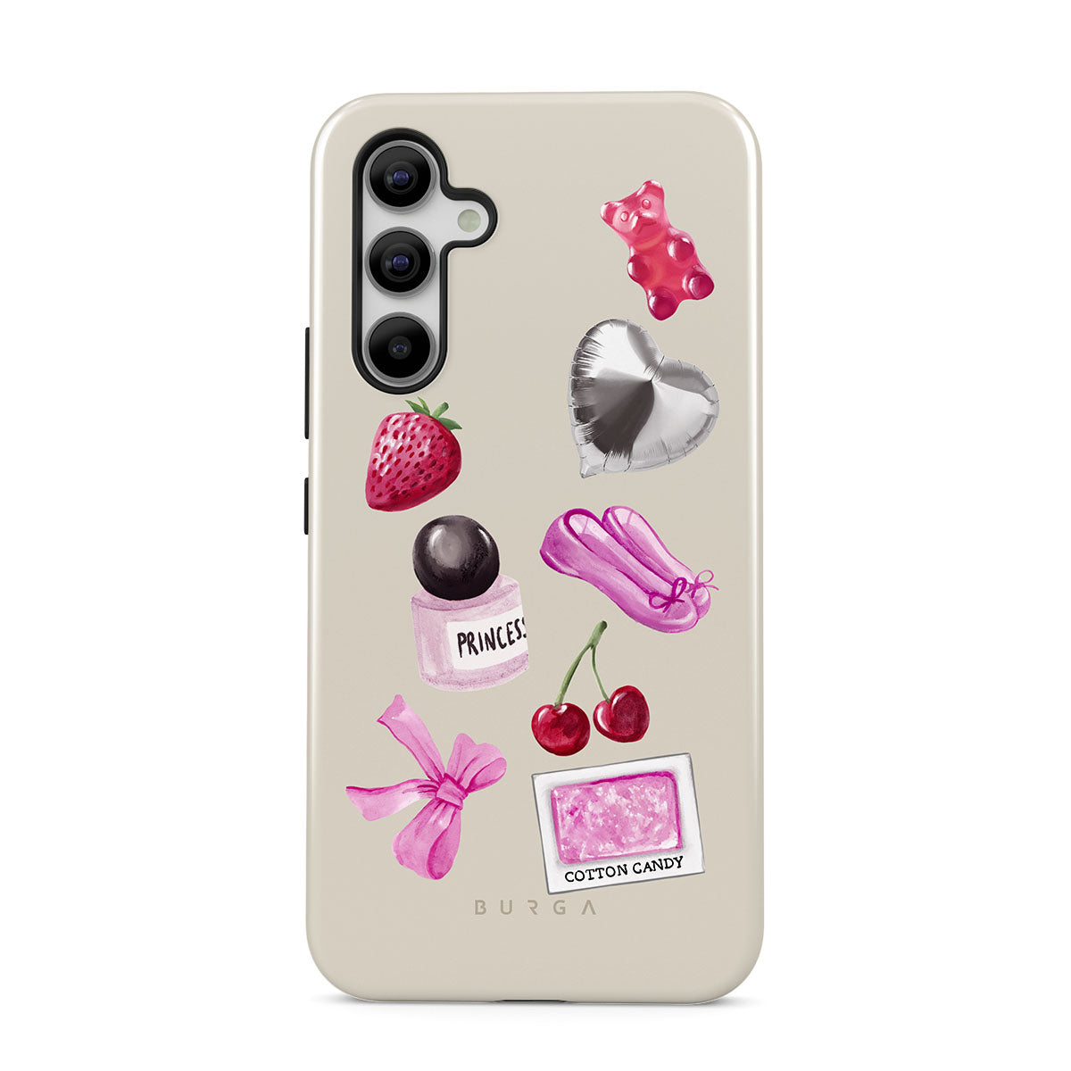 Este design contém: laço rosa, balão prateado em forma de coração, frasco de perfume, morango, cerejas, sapatilhas de ballet rosa, adesivo de algodão doce, ursinho de goma rosa.