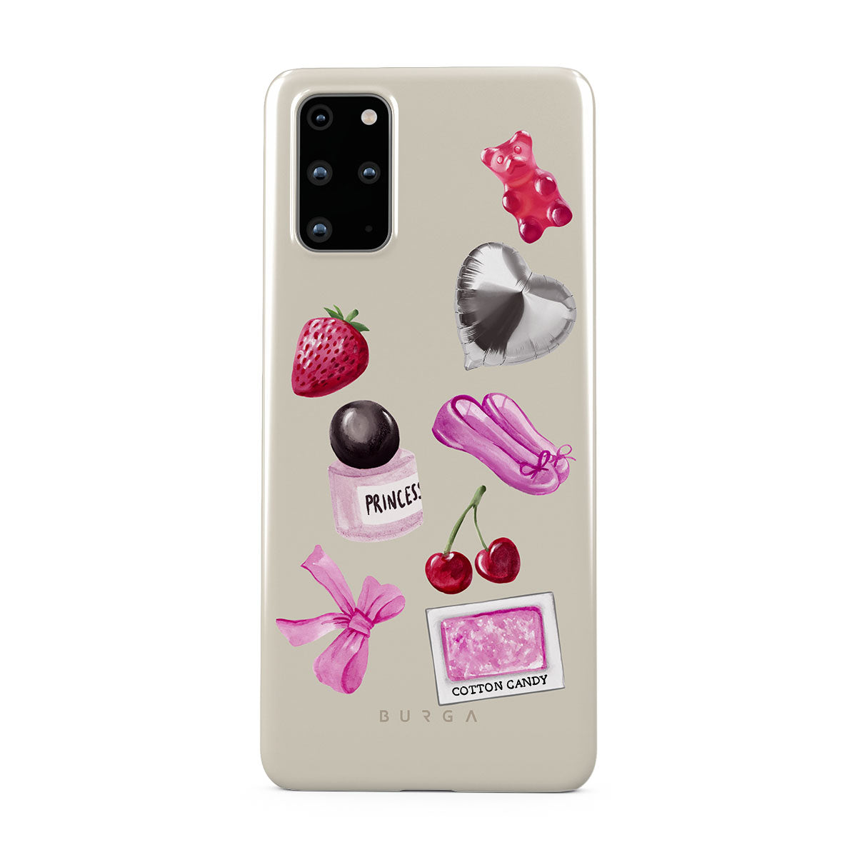 Este design contém: laço rosa, balão prateado em forma de coração, frasco de perfume, morango, cerejas, sapatilhas de ballet rosa, adesivo de algodão doce, ursinho de goma rosa.