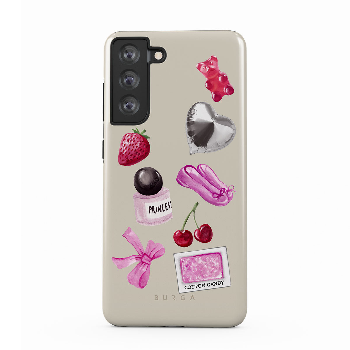 Este design contém: laço rosa, balão prateado em forma de coração, frasco de perfume, morango, cerejas, sapatilhas de ballet rosa, adesivo de algodão doce, ursinho de goma rosa.