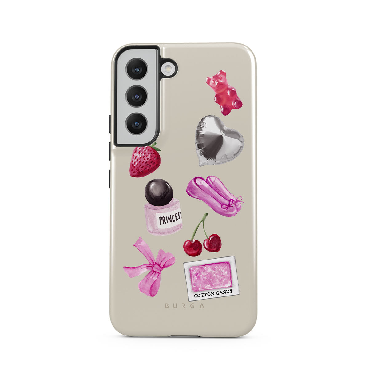 Este design contém: laço rosa, balão prateado em forma de coração, frasco de perfume, morango, cerejas, sapatilhas de ballet rosa, adesivo de algodão doce, ursinho de goma rosa.