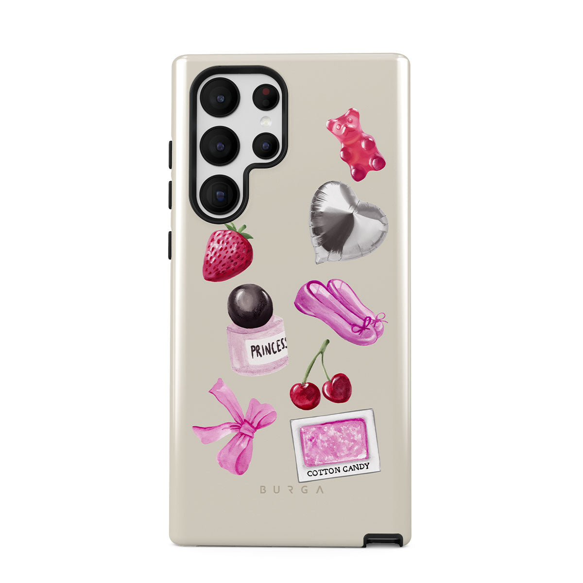 Este design contém: laço rosa, balão prateado em forma de coração, frasco de perfume, morango, cerejas, sapatilhas de ballet rosa, adesivo de algodão doce, ursinho de goma rosa.