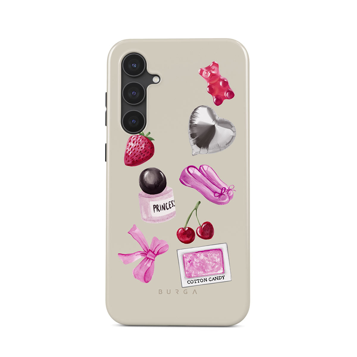 Este design contém: laço rosa, balão prateado em forma de coração, frasco de perfume, morango, cerejas, sapatilhas de ballet rosa, adesivo de algodão doce, ursinho de goma rosa.