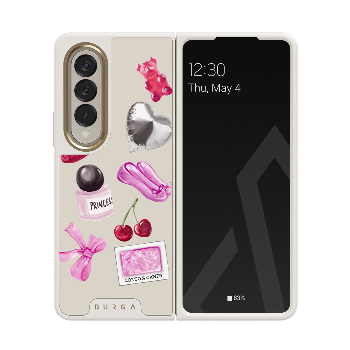Este design contém: laço rosa, balão prateado em forma de coração, frasco de perfume, morango, cerejas, sapatilhas de ballet rosa, adesivo de algodão doce, ursinho de goma rosa.