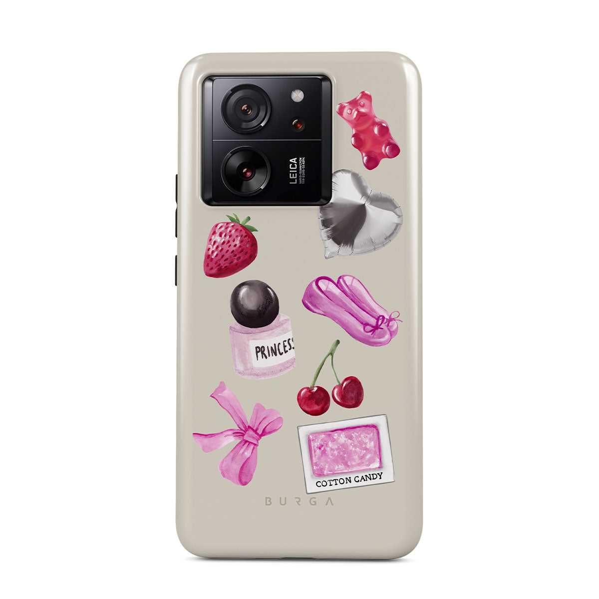 Este design contém: laço rosa, balão prateado em forma de coração, frasco de perfume, morango, cerejas, sapatilhas de ballet rosa, adesivo de algodão doce, ursinho de goma rosa.
